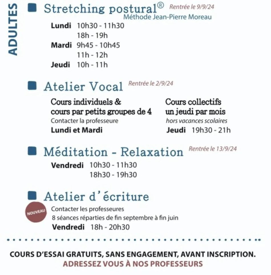 Si vous êtes encore indécis, un premier cours d’essai gratuit vous permettra de faire votre choix parmi nos activités hebdomadaires.