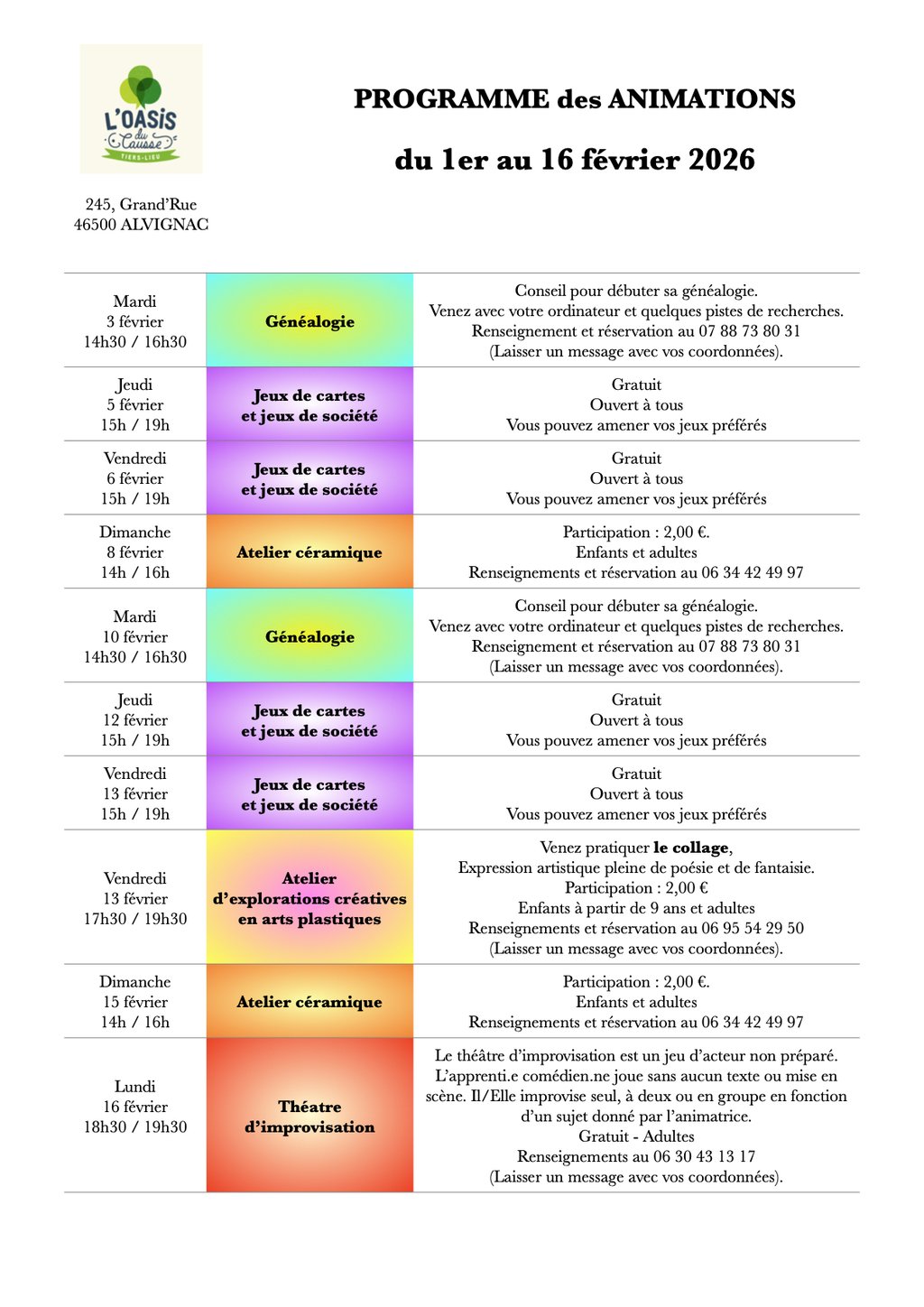 Programme des animations proposées en février par le Tiers-lieu L'Oasis d'Alvignac .